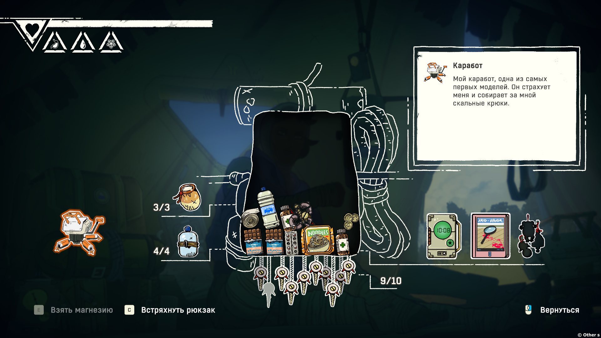 Берегите крючья, магнезию, пластырь, а также еду, воду и лекарства во время долгого подъёма. Разбивайте биваки и осматривайте горные террасы, чтобы собрать ресурсы в дорогу. - — ПОТРЯСАЮЩАЯ КОМАНДА
