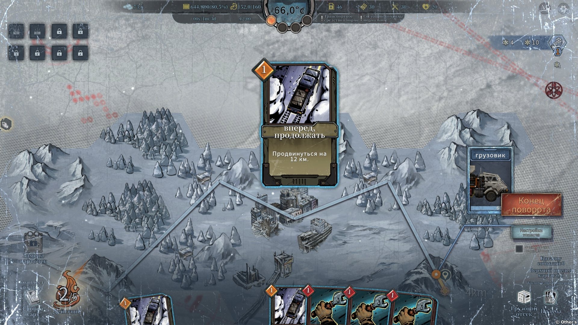 На заснеженных просторах тебя ждёт всё более суровый холод, голод, стресс и повреждения транспорта. Только справившись с этими проблемами, ты сможешь продвинуться дальше. Топливо, еда, предметы первой необходимости, боеприпасы, инструменты… Грузы — это не просто товар для торговли, но и ресурсы для выживания. Грамотно управляй своими запасами. - — Исследуй путь развития и управления: